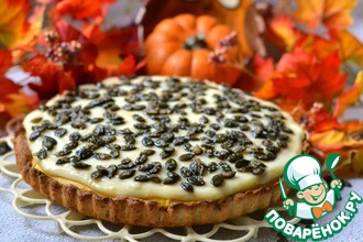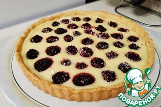 За это время песочная основа подрумянится, но останется довольно мягкой. Равномерно распределяем клюквенную начинку и отправляем в духовку ещё на 5 минут, чтобы начинка слегка схватилась сверху. По истечении времени достаем пирог из духовки.