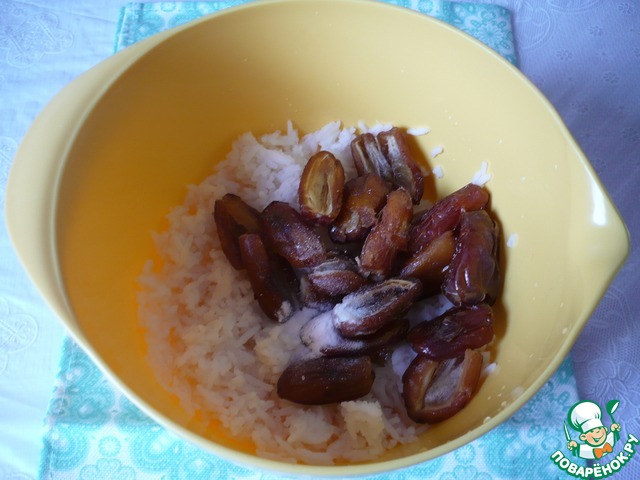 Финики нужно промыть и очистить от косточек. В глубокую чашку выложить отварной рис, финики (100 г) и ванилин.