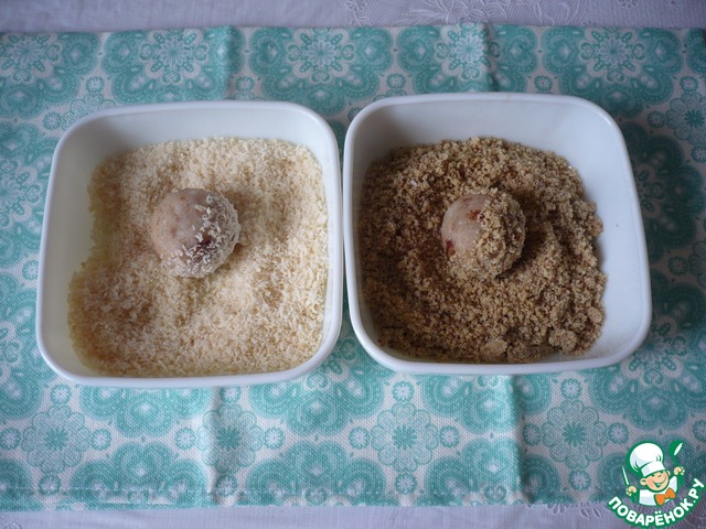 Теперь приступим к приготовлению десерта. Влажными руками сформируйте из приготовленной смеси риса и фиников шарики. Каждый шарик обваляйте в кокосовой стружке и измельченных грецких орехах. У меня получилось 12 штук: 6 шт. в кокосовой стружке и 6 шт. в измельченных грецких орехах.