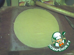 В оригинале делается три коржа. У меня получилось 4 диаметром около 26 см. Раскатываем на бумаге - перенести корж не получится. Чтоб не липло к скалке, перед каждым коржом обмываем ее теплой водой и вытираем насухо. Тесто может рваться - ничего страшного в этом нет; еще легче, чем рвется, оно "латается" - достаточно аккуратно приложить кусочек теста и пройтись скалкой еще раз. -
