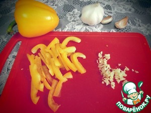 Нарежьте жёлтый перец соломкой. Чеснок измельчите при помощи ножа.
