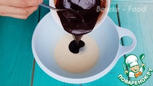 Затем в яичную массу добавляем шоколадную смесь и хорошо перемешиваем