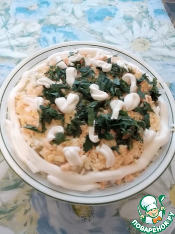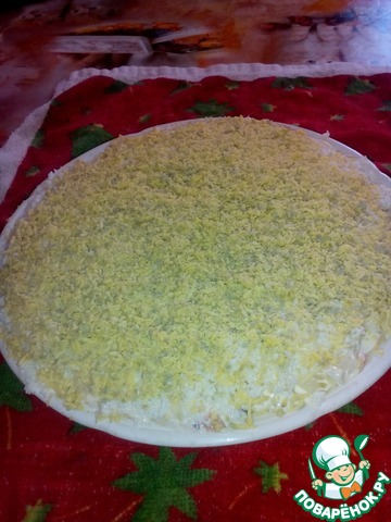 Салат делаем слоями. Каждый слой, за исключением майонеза, слегка утрамбовываем ложкой или лопаткой. До подачи на стол держим салат в холодильнике (лучше готовить за несколько часов до подачи, он должен пропитаться).