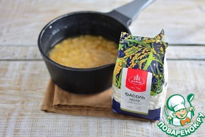 Фасоль отварить согласно инструкции на упаковке, бульон не выливать.