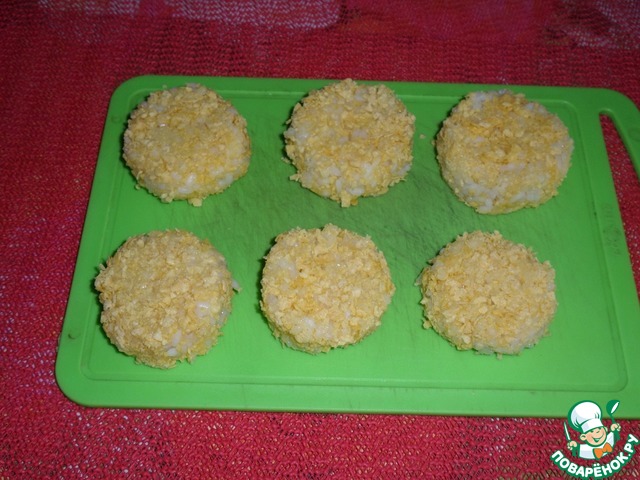• Ложкой выкладываем рисовую массу в чашку с измельченными хлопьями. Хорошо обваливаем. Придаем форму будущим "сырникам".