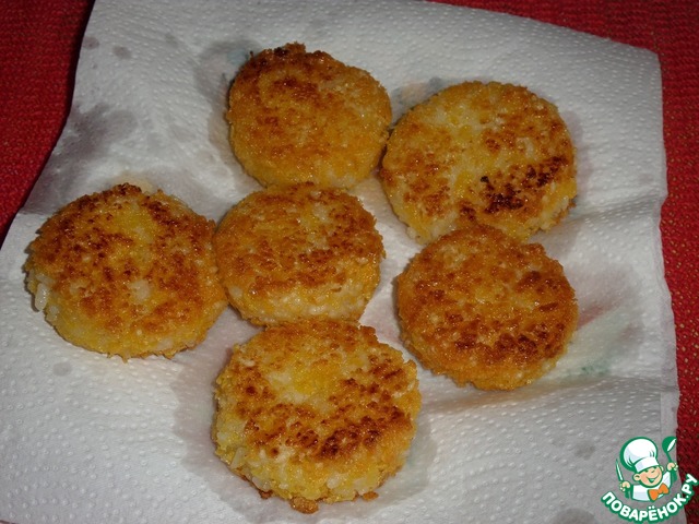 • Обжаренные рисовые "сырники" выкладываем на бумажные полотенца, убирая лишнее масло.