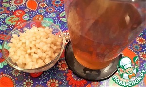 На следующий день очищаем от кожуры и режем мелким кубиком грушу. Мандариновый напиток процеживаем прямо перед приготовлением ризотто, он нам нужен горячий.