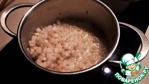 В кастрюльке (сотейнике) с толстым дном прогреваем оливковое масло, всыпаем туда рис. Готовим рис при постоянном помешивании до лёгкой прозрачности. Вливаем туда белое сухое вино. Тщательно перемешивая выпариваем вино. Напоминаю, ризотто всегда готовится без крышки!