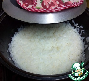 Рис промыть, залить водой, варить под крышкой на умеренном огне в течение 15 минут. При варке посолить, перемешать. Через 15 минут огонь убавить, томить под крышкой в течение 5 минут.