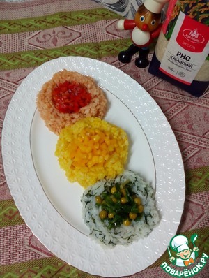 По 2 ст. л. риса выложить на три тарелки. В одну добавить молотую куркуму и перемешать; во вторую - молотую сладкую паприку и томатную пасту, перемешать; в третью - измельчённый шпинат (у меня его не оказалось, добавила мелко нарезанную зелень укропа).