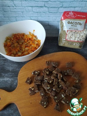 2-3 ломтика хлеба посыпать солью и обжарить в тостере. Как вариант можно нарезать на квадратики и обжарить на сковороде с небольшим добавлением растительного масла или подсушить в духовке. Я делала в тостере так быстрее всего.