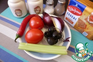 Сельдерей нарезать тонкими слайсами, помидоры нарезать дольками, перец чили измельчить. Добавить маслины и маринованный лук.