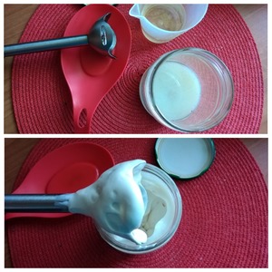 Так как сейчас идёт Пост, я сделаю постный домашний майонез на жидкости из-под зелёного горошка. Из количества ингредиентов, которые я указала, у меня получится почти пол-литровая банка майонеза, который я буду использовать не только для этих бутербродов. Наливаем в банку жидкость из-под зелёного горошка, добавляем туда горчицу, соль, сахар, лимонный сок и взбиваем погружным блендером. Тонкой струйкой добавляем подсолнечное масло, постоянно взбивая движениями "вверх-вниз". Взбиваем до густой консистенции. У меня ушло 300 мл масла. Соль, сахар и горчицу корректируйте под себя на свой вкус. Меня устраивает количество ингредиентов данное мной в рецепте.