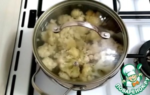 Цветную капусту нужно разделить на соцветия, промыть и отварить в подсоленной воде примерно 5 минут.