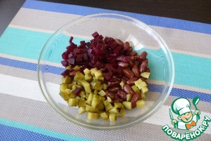 • Нарезать кубиками соленые огурцы и вареную свеклу. Переложить в миску к сваренной фасоли.