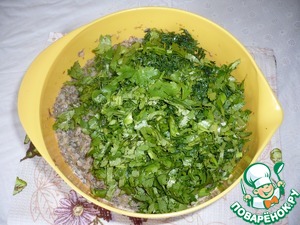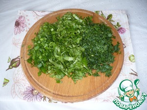 Мелко нарезать кинзу, укроп и зеленый лук.