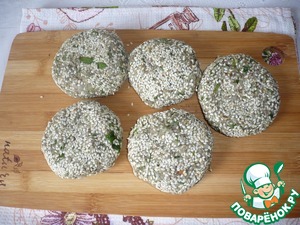 Теперь формуем котлеты из гречневого фарша и обваливаем их в кунжутном семени.