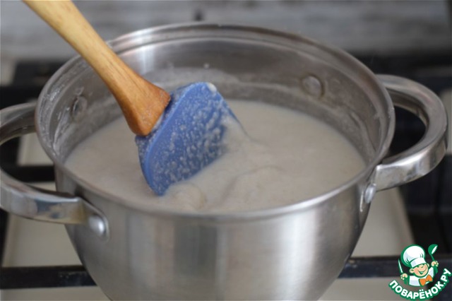 Варить на умеренном огне, постоянно помешивая, до загустения. На это понадобится 4-5 минут. Затем влить в кастрюлю оставшуюся воду и довести смесь до кипения. Проварить буквально минуту. Главное, не переварить! Иначе будет проблематично процеживать молоко.