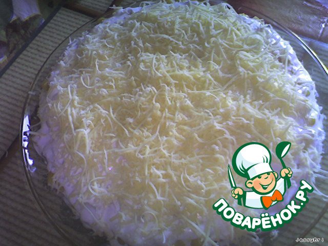 Выкладываем рис слоем примерно 0,5 см, немного присаливаем, сбрызгиваем лимонным соком и смазываем майонезом