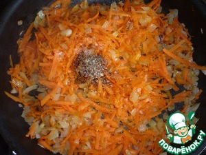 Морковь натереть на крупной терке, добавить к луку и продолжить обжаривать лук с морковью до мягкости.