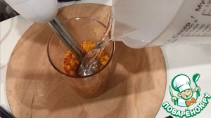 Облепиху с небольшим количеством воды измельчаем блендером. Вливаем оставшуюся воду и процеживаем через сито.