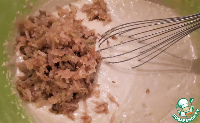 Вводим муку, разрыхлитель, соль, растительное масло. Всё тщательно перемешиваем. Отжимаем сок из груши; его выпиваем, а грушу отправляем в тесто. Ещё раз хорошенько перемешиваем.