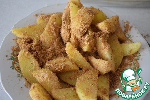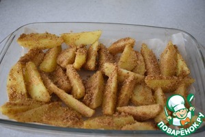 В сухую емкость высыпать картофель и оливковое масло. Все перемешать. Всыпать панировочные сухари. Все аккуратно перемешать, чтобы покрыть картофель со всех сторон.