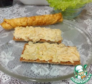 • Для намазки хлебцев приготовим сырно-луковую массу. Половину репчатого лука нарезать тонкими полукольцами, подрумянить на антипригарной сковороде с добавлением щепотки сахара для карамелизации. Сыр натереть на мелкой тёрке, смешать с карамелизированным луком и майонезным соусом. Можно добавить один измельчённый зубчик чеснока для большей остроты закуски.