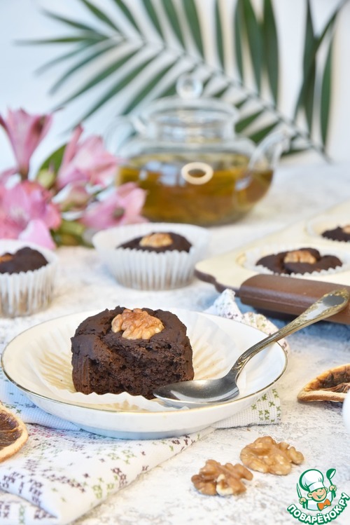 Выложить фасолевое тесто в гофрированные бумажные формы для кексов, заполнив их на 3/4. Сверху кексы украсить половинкой грецкого ореха.