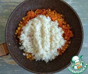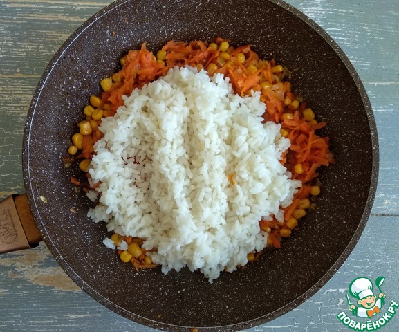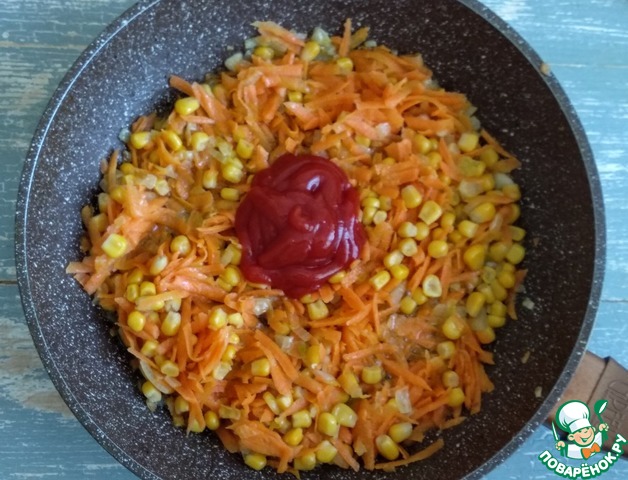 Затем добавить морковь, натёртую на крупной тёрке, консервированную кукурузу и кетчуп (или томатную пасту). Обжаривать ещё 2-3 мин.