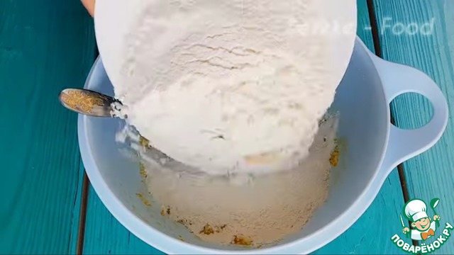 Затем добавляю часть просеянной муки, разрыхлитель все перемешиваем, и после добавляю оставшуюся муку и замешиваю тесто