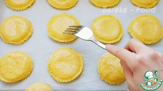 И перекладываем на противень застеленной пергаментом, желток смешиваю с молоком и смазываю печенья, затем вилкой делаю рисунок и отправлю в заранее разогретую духовку и выпекаю при 180 градусах 15-20 минут