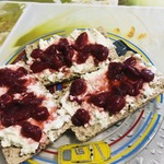 Поверх сыра выкладываем пряную вишневую массу (около 1 ст. л. на каждый хлебец).