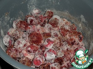 В кастрюлю/ковш выкладываем вишню без косточек (можно взять замороженную), сахар, крахмал и корицу. -