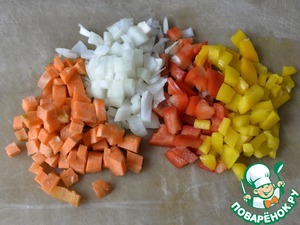 Лук, морковь и перец моем, чистим. Я брала для красоты два цвета перца. Режем овощи кубиками.