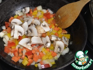 Добавляем нарезанные шампиньоны, перемешиваем. Обжариваем 5 минут.