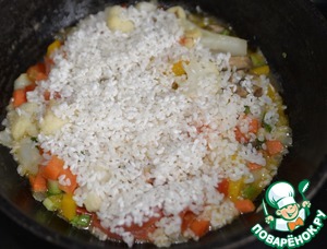 Равномерно засыпаем сверху овощей рис.