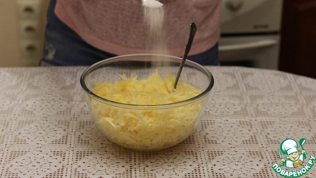 Кабачок очищаем от кожицы и от семян. Натираем на терке. Если кабачки молоденькие, то необязательно их чистить. Кожица и семечки у них нежные. После того как мы натерли, посыпаем солью и на 15 минут отставляем в сторонку, дожидаемся, когда он даст сок.