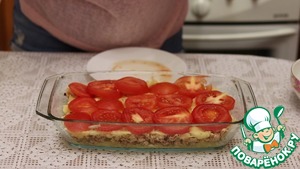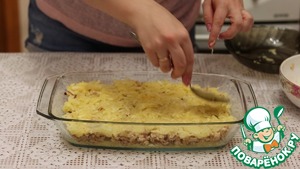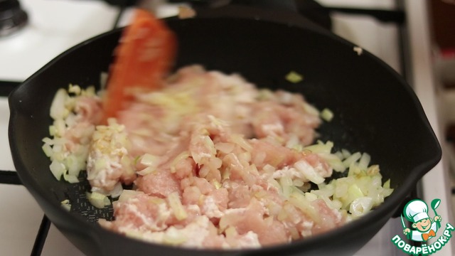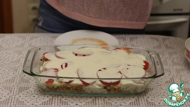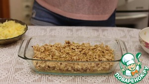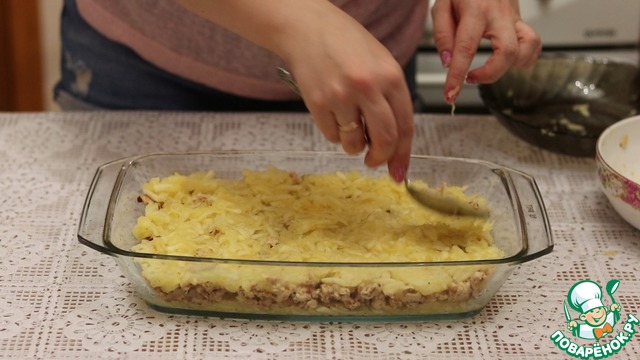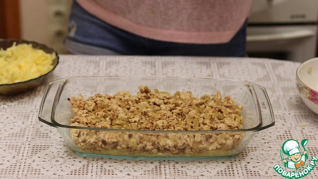 Второй слой обжаренный фарш. Равномерно его распределяем.