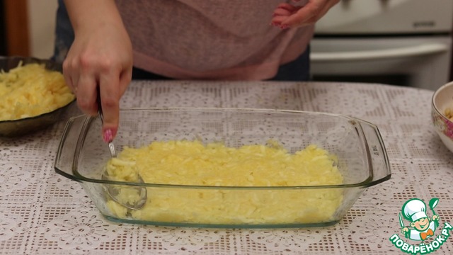 Берем огнеупорную форму, смазываем растительным маслом. Выкладываем половину кабачка, предварительно его отжав.