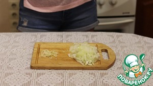 Лук чистим, моим и мелко нарезаем кубиками. Чеснок очищаем и мелко рубим.