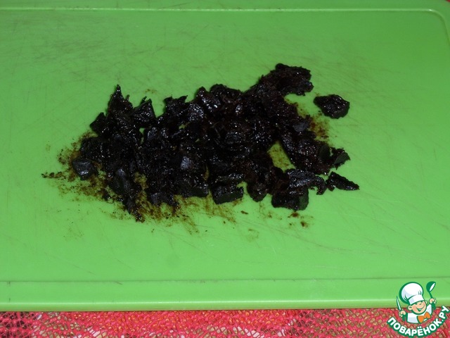 Затем добавляем отваренную гречневую крупу, нарезанный чернослив и щепотку соли.