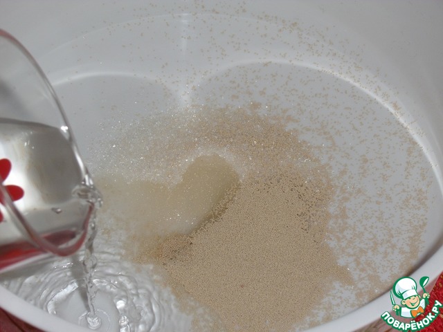 В чашку кладем 1 ст. л. сахара и сухие дрожжи. Добавляем теплую воду. Перемешиваем и оставляем на 5 минут.