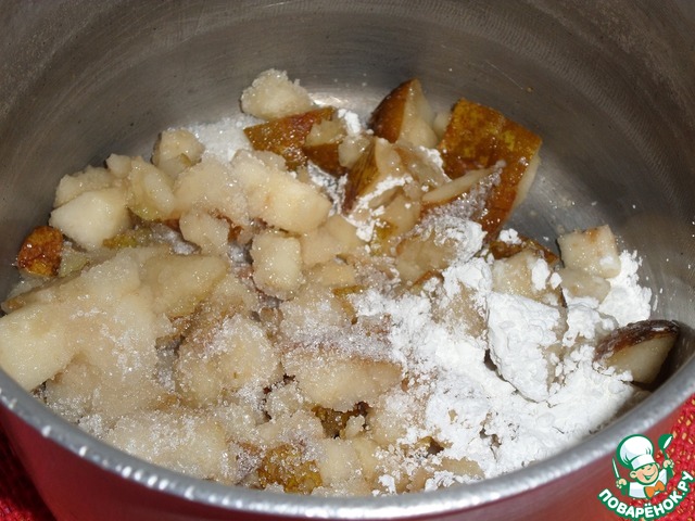 Пока подходит тесто, приготовим грушевый соус. Груши промываем и нарезаем кубиком. Выкладываем в кастрюлю. Добавляем 2 ст. л. сахара и кукурузный крахмал. Перемешиваем массу. Отправляем кастрюлю на огонь.