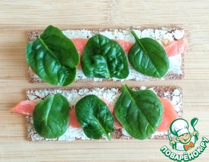 Простой вариант вкусной и быстрой закуски, приготовленной из тонких хлебцев ТМ "Щедрые" с творожным сыром, сёмгой и шпинатом.