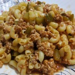 В оливковом масле обжарить говяжий фарш до момента, когда уйдет лишняя влага. Добавить кетчуп и обжарить еще несколько минут. Добавить мелко нарезанный репчатый лук и маринованные огурцы. Огурцы лучше брать сладковатые, как в идут в бургерах. Добавить соль и черный молотый перец. Тушить еще несколько минут. Соединить с макаронами и перемешать. Обильно посыпать сыром.