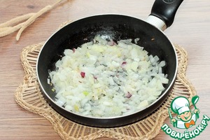 4. Приготовим зажарку. Лук и чеснок очищаем и нарезаем: лук небольшими кубиками, чеснок мелко рубим. Обжариваем на разогретом растительном масле вначале лук и через 2 минуты добавляем чеснок, пассеруем до готовности.