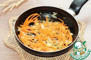 6. К оставшейся пассеровке добавляем растительное масло и обжариваем порезанную соломкой морковь.