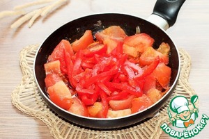 8. Помидор без шкурки разрезаем дольками, очищенный от семени сладкий перец и острый - соломкой. Добавляем в сковороду: овощи и сок от помидора, соевый соус и приправу, по вкусу соль и сахар.