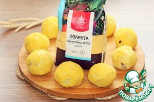 Влажными руками формируем из каши шарики, величиной с большой грецкий орех и панируем в поленте.